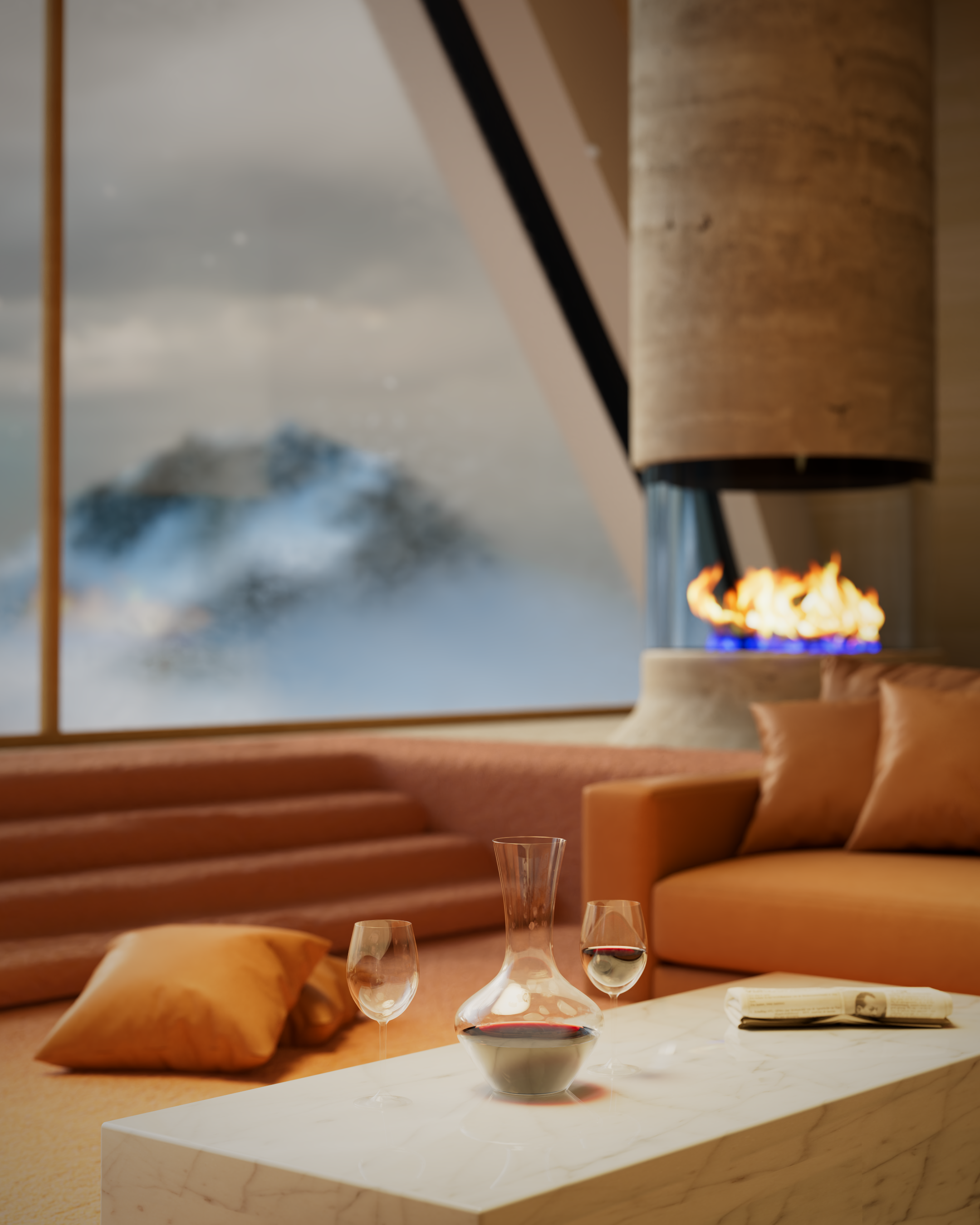 Frosted windows and Fireplaces.